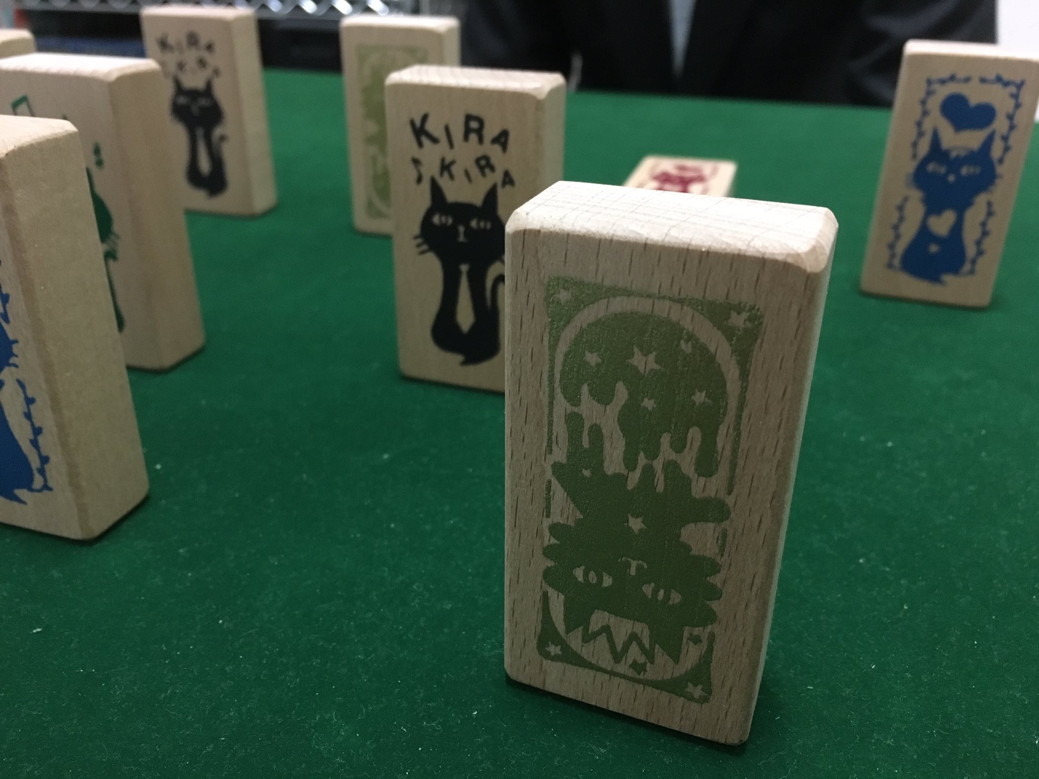 賽苑さんの二人用ゲーム。対戦相手との間にネコのタイルを立てて並べ、手前か奥のどちらかに倒す、もしくはパスして残りを全て相手に倒してもらうだけというシンプルさ。