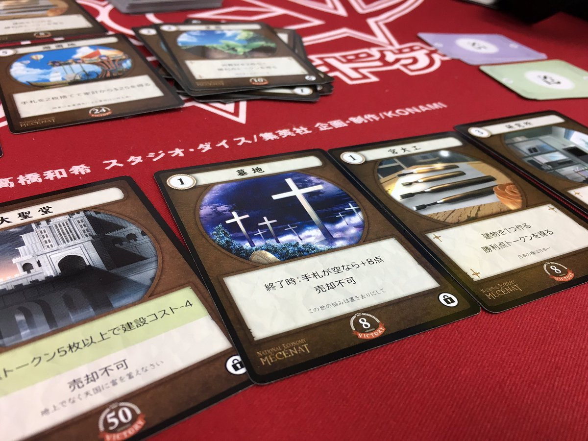 というのも、ドロー系のカードが山のように入っているので、引き運に左右されにくくなっている。また、新たに追加された勝利点トークンだけでなく、直接得点できるカードが全体的に増えている印象で、無印に比べてかなりマイルドなプレイ感だった。